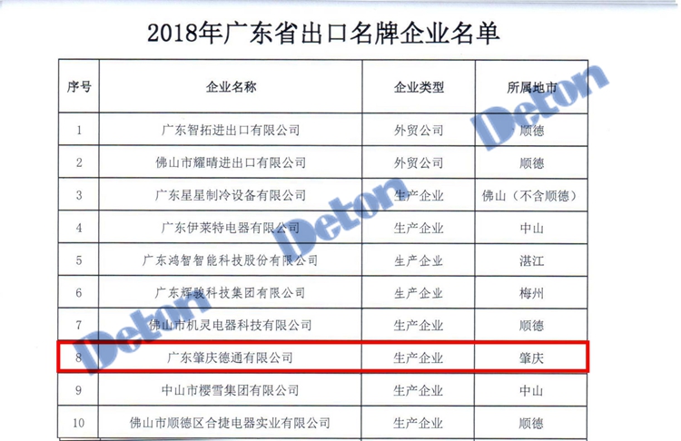 10月23日下午,在廣東商務廳的指導下,“2018年度廣東省出口名牌企業發布推介會”在廣交會展館舉行,會上,主辦方發布了廣東省出口名牌企業名單,據悉,經申報材料資格審查、20多位行業專家評定、公開征求意見等多項環節,廣東省共有79家企業被認定為“2018年度廣東省出口名牌企業”,德通公司便是其中之一,該評定每年評審一次,德通已經連續多年獲得此殊榮。